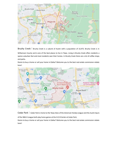 Brushy Creek:Brushy Creek is a suburb of Austin with a population of 22,972. Brushy Creek is in Williamson County and is one of the best places to live in Texas. Living in Brushy Creek offers residents a sparse suburban feel and most residents own their homes. In Brushy Creek there are a lot of coffee shops and parks.