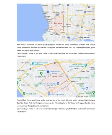 Mar Vista: Mar Vista has mostly quiet residential streets and a few commercial corridors with unique shops, restaurants and local businesses. Great place for families! Mar Vista has safe neighborhoods, great parks, and highly rated schools.