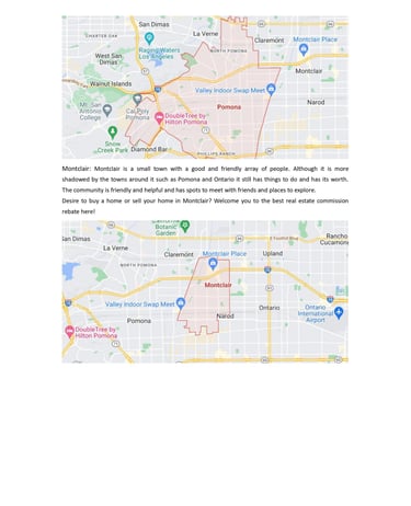 Montclair: Montclair is a small town with a good and friendly array of people. Although it is more shadowed by the towns around it such as Pomona and Ontario it still has things to do and has its worth. The community is friendly and helpful and has spots to meet with friends and places to explore.