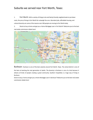 Burleson: Burleson is one of the best suburbs around Fort Worth, Texas. The school district is one of the best at teaching the next generation of adults. The diversity in Burleson is one of a kind because it attracts all kinds of people creating a great community. Southern hospitality is a huge way of living in Burleson.