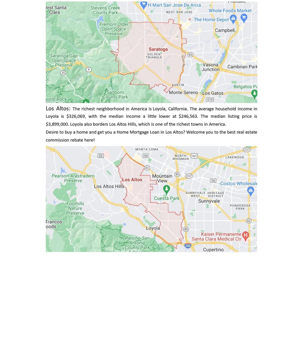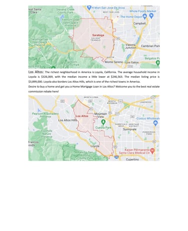 Los Altos: The richest neighborhood in America is Loyola, California. The average household income in Loyola is $326,069, with the median income a little lower at $246,563. The median listing price is $3,899,000. Loyola also borders Los Altos Hills, which is one of the richest towns in America.